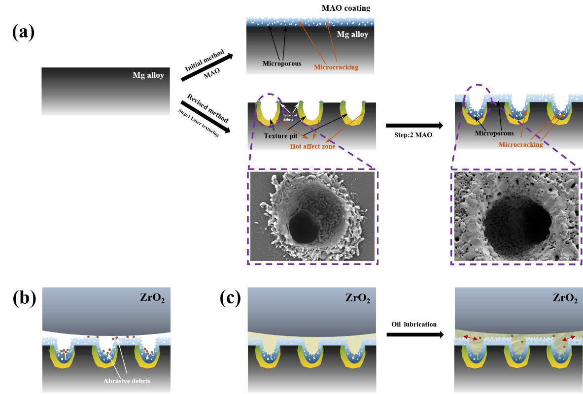 课题组二年级硕士研究生杨慧云在陆海林老师指导下以第一作者身份发表中科院一区TOP期刊论文。本研究采用激光织构技术对微弧氧化陶瓷涂层进行改善。通过对激光织构化后的镁合金进行微弧氧化处理而形成的陶瓷涂层具有“双孔”系统,能够提高陶瓷涂层的摩擦学性能。文章详细解释了涂层的形成机理和摩擦机理,为拓宽镁合金微弧氧化涂层的应用范围提供了研究思路。