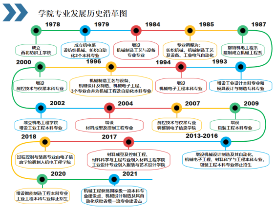 学院现有机械工程、机械设计制造及其自动化、机械电子工程、过程装备与控制工程、智能制造工程5个本科专业,其中机械工程为国家级一流专业建设点和教育部卓越工程师教育培养计划专业,机械设计制造及其自动化为省级一流专业建设点且通过工程教育专业认证,智能制造工程为新工科专业。学院专业发展历史如图所示。