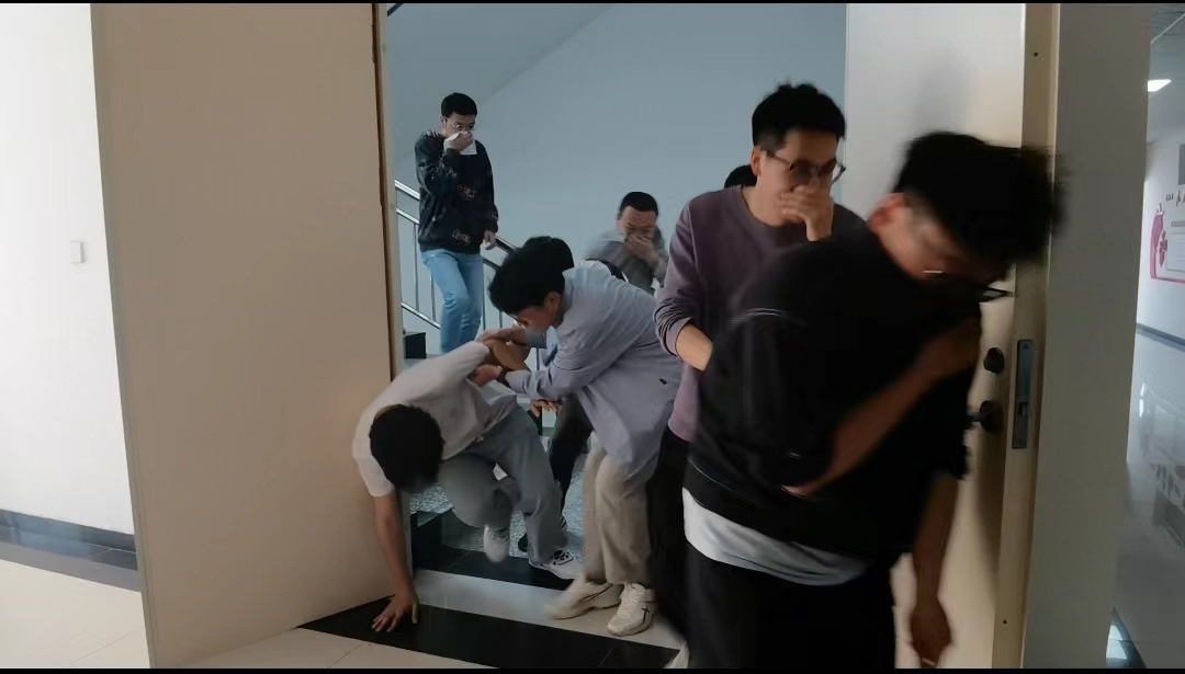 演练开始,烟雾四起,老师们合理分工,迅速进入状态,前往指定位置,引导学生安全撤离。“捂住口鼻”“弯腰前进”“小心脚下”的指引声此起彼伏;意外摔倒的学生立马被身边人扶起,继续撤离。师生在短短时间全部撤至安全区域。在此次演练中,全体老师面对突发情况保持镇定,合理安排人员,引导学生迅速有序撤离;同学间互帮互助,尽显情谊。