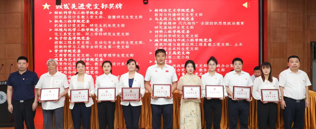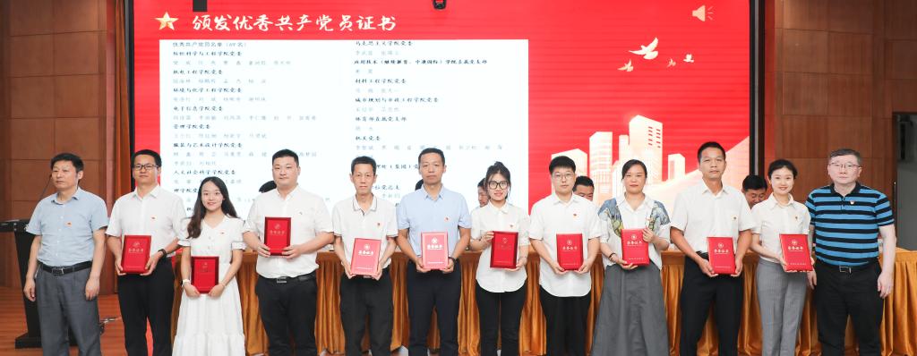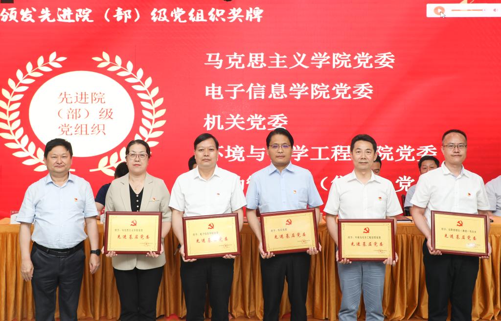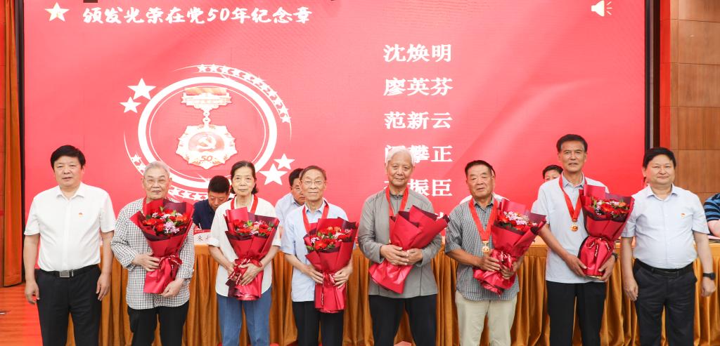 会上,校党委副书记赵小峰宣读了《中共Beat365中文官方网站委员会关于表彰优秀共产党员、优秀党务工作者先进基层党组织的决定》,与会校领导为党龄满50年的6名老党员代表颁发了“光荣在党50年”纪念章,为受表彰的优秀共产党员、优秀党务工作者、先进院(部)级党组织和先进党支部代表颁发了奖牌和证书。马克思主义学院党委书记杨永革、Beat365中文官方网站研究生党支部副书记孟杰、理学院党委副书记文毅、新媒体艺术学院教师王晨仰分别代表受表彰的先进集体和个人作了交流发言。