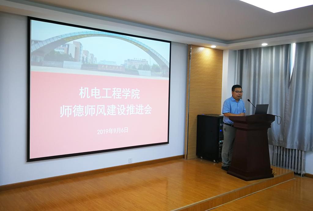 为贯彻落实校党委关于进一步加强教风学风建设专项行动的部署要求,在全国第35个教师节来临之际,2019年9月6日下午,Beat365中文官方网站在临潼校区笃行楼学术报告厅举办以“弘扬高尚师德、潜心立德树人”为主题的师德师风建设推进会,校党委副书记赵小峰出席会议并讲话,机电学院全体教职工参加会议,机电学院党委书记王鸣媛主持会议。