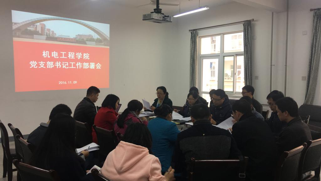 11月9日,机电学院召开全体党支部书记会,学习传达党的十八届六中全会精神,学院党委书记杨永革、党委副书记魏哲和全体党支部书记参加了会议,会议由杨永革主持。
