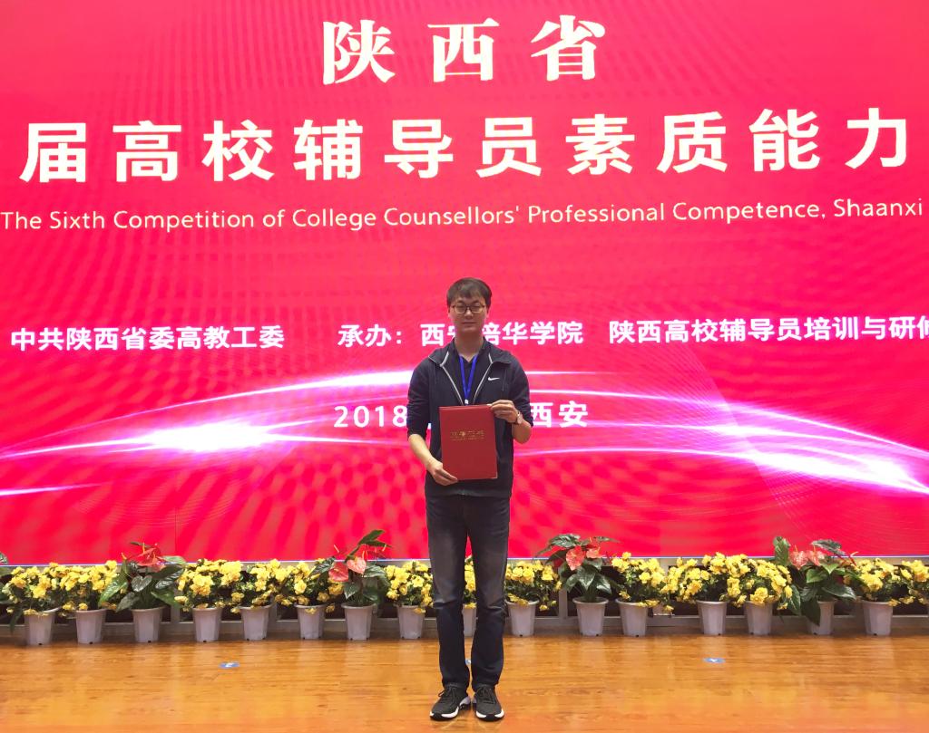 2018年4月28日,陕西省第六届高校辅导员素质能力大赛决赛在西安培华学院圆满落幕,来自全省79所高校的123名辅导员参加了比赛,Beat365官网Beat365中文官方网站2015级辅导员秦方刚经过四个环节的激烈比拼后脱颖而出,荣获三等奖。