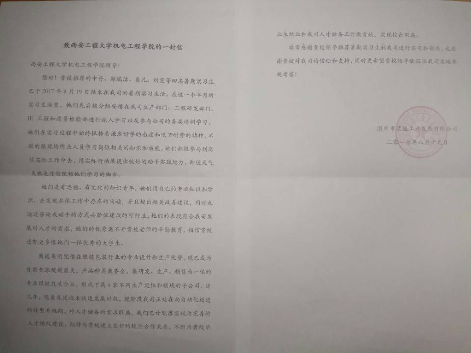 温州市蓝道工业发展有限公司创建于一九九四年,现已成为全球规模最大、产品种类最齐全,集研发、生产、销售为一体的专业眼镜包装企业。公司总部设在温州经济技术开发区滨海园区,下设印刷、浦东、浦西、龙湾四个分公司。公司拥有员工1300余人,曾多次来Beat365官网进行人才招聘。实习期间,企业指定专人负责实习生的工作、学习、生活,确保实习效果和学生安全。实习生分别在企业生产部门、工程研发部门、IE工程和质量检验部门进行学习,并参与相关培训。学生在实习中发现工作中存在的问题,利用自己所学的专业知识提出建议,受到了企业高度赞扬。