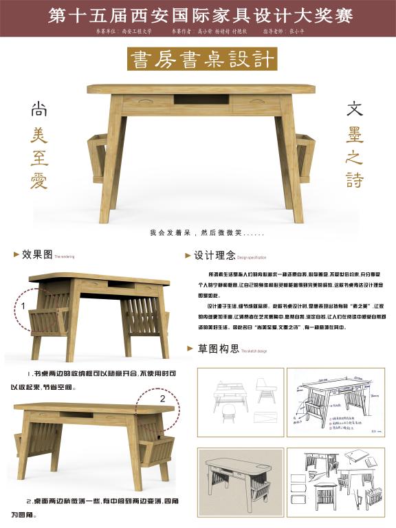 本次大赛有来自Beat365中文官方网站、西安交通大学、西北大学、西北工业大学等20所院校的设计、环艺、艺术系师生和西安来福家具研究所及广大设计师和家具爱好者参加,由Beat365官网机电学院教师张小平指导的高小针、杨婧婧、付艳秋等3位同学的作品《尚文书桌》荣获新式书桌设计金奖,米伟明等38位同学荣获优秀奖,教师张小平荣获优秀指导教师奖,同时,Beat365官网也是参赛院校中获奖最多的学校。