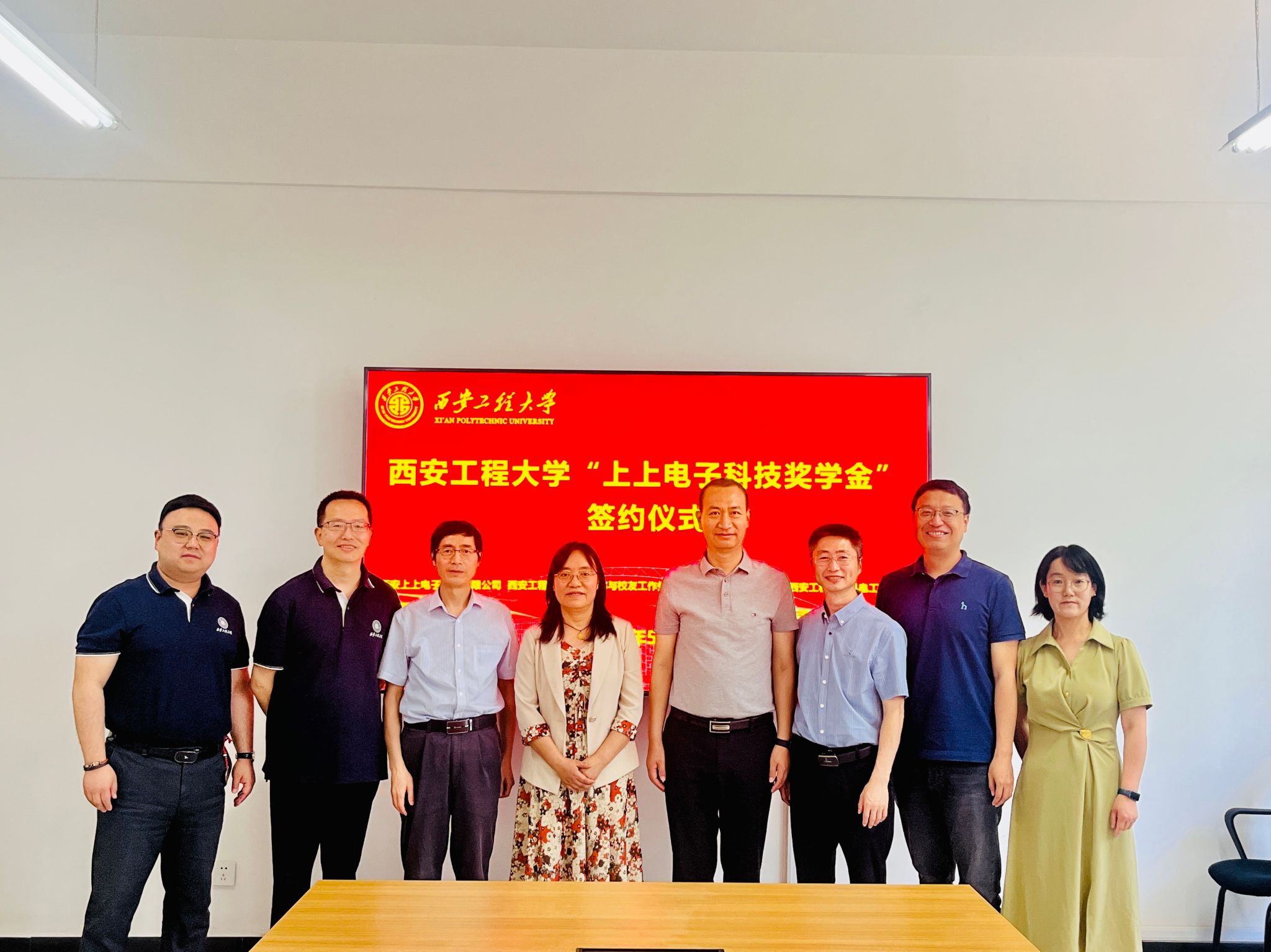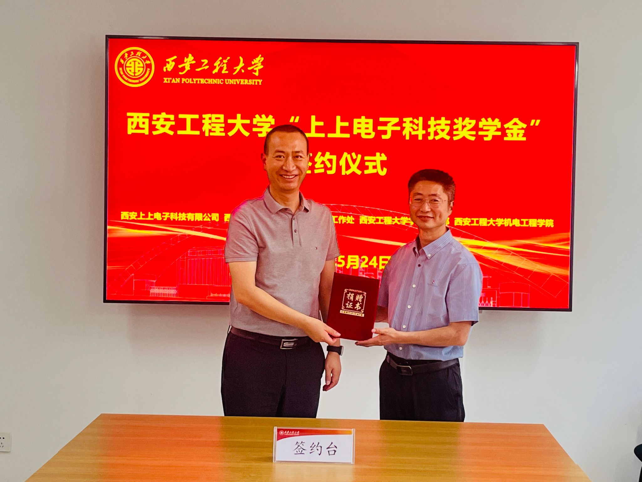 在奖学金签约仪式上,阚佩代表学院向西安上上电子科技有限公司董事长吴建军表达了热烈欢迎,赵小惠介绍了学院的发展历程、学科设置、专业发展、师资力量和人才培养等情况,吴建军介绍了企业的基本状况和主要业务,双方就奖学金设置的初衷和目的进行了深入交流,希望未来能在技术和人才方面进行深度合作,赵小惠和吴建军共同签署了《上上电子科技奖学金协议》,王志为吴建军颁授捐赠证书。