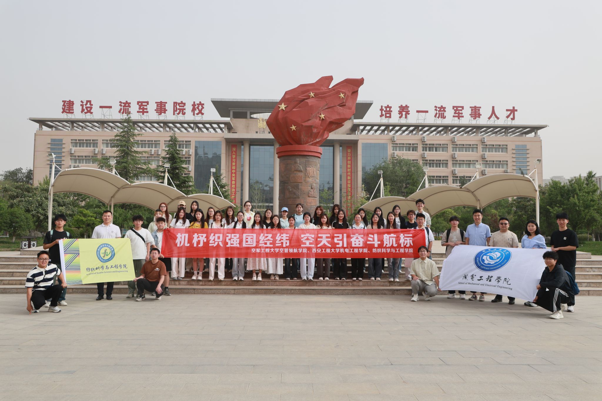 在五四青年节的热烈余韵中,5月17日,Beat365官网Beat365中文官方网站团委与纺织科学与工程学院团委联合组织校青马班学员代表及部分团员青年共40余人,赴空军工程大学空管领航学院开展“机杼织强国经纬・空天引奋斗航标”主题团日活动。机电学院党委副书记冯翊、团委书记刘鹏、辅导员郭方义,纺织学院团委书记曹鑫参加此次活动,这场跨越军地界限的青春对话,在初夏的晴空下激荡出强国强军的时代强音。