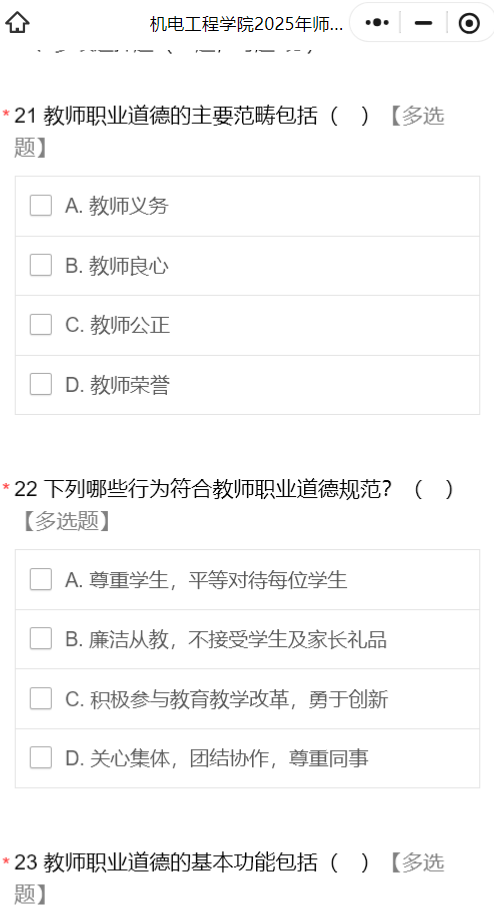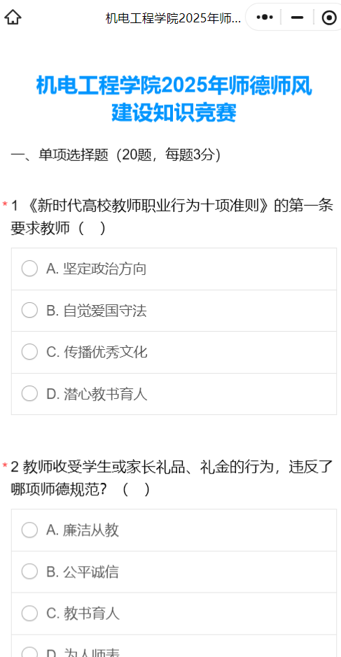 为进一步增强教师依法从教意识,规范教师依法从教行为,持续完善教职工师德师风建设,坚持师德师风建设常态化,Beat365中文官方网站各党支部充分利用组织生活会、教学法、专题学习会、案例学习分享等多种形式广泛开展专题师德师风学习。为检验阶段学习成果,提高广大教职工学习主动性和积极性,在学院党委的部署和指导下,分工会于2025年7月8日至7月9日,以在线答题形式开展了《Beat365中文官方网站2025年师德师风建设知识竞赛》, 50余位教职工积极参加此次竞赛,并且积极开展讨论,营造出了全员学习、共同进步的良好氛围。(撰稿:孙戬 审核:阚佩)