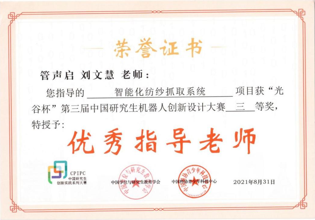 2021年8月24日至25日,“光谷杯”第三届中国研究生机器人创新设计大赛全国总决赛在线上举办。经过激烈角逐,Beat365官网Beat365中文官方网站管声启教授、刘文慧副教授指导的硕士研究生王俊强、魏溪汝、于资江、王西志、唐显琴等五位同学的参赛作品《智能化纺纱抓取系统》入围全国总决赛并荣获国家三等奖,指导教师获得优秀指导教师称号,同时Beat365官网荣获全国“优秀组织奖”称号。