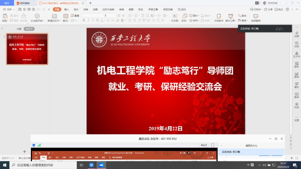 强化指导,做好学生的领路者。习近平总书记曾说:“要用中国梦激扬青春梦,为学生点亮理想的灯,照亮前行的路”。导师团成员积极引导学生利用好线上资源、做到停课不停学,确保疫情防控期间学习质量不掉线。组织学生们参加昆明理工大学的“大学生职业生涯规划”网课,引导学生们对自己的职业生涯有了新的认识,并每个人结合自己的实际情况撰写了职业生涯规划书;邀请了陕西省人才交流中心毕业生就业指导专家李盾给2017级本科生做了主题为“U盘化生存——用新的择业观来应对未来职场”的主题报告;组织2016级优秀学生给2017级本科生做了就业、考研、保研经验交流,为他们下一步的奋斗目标夯实了基础。