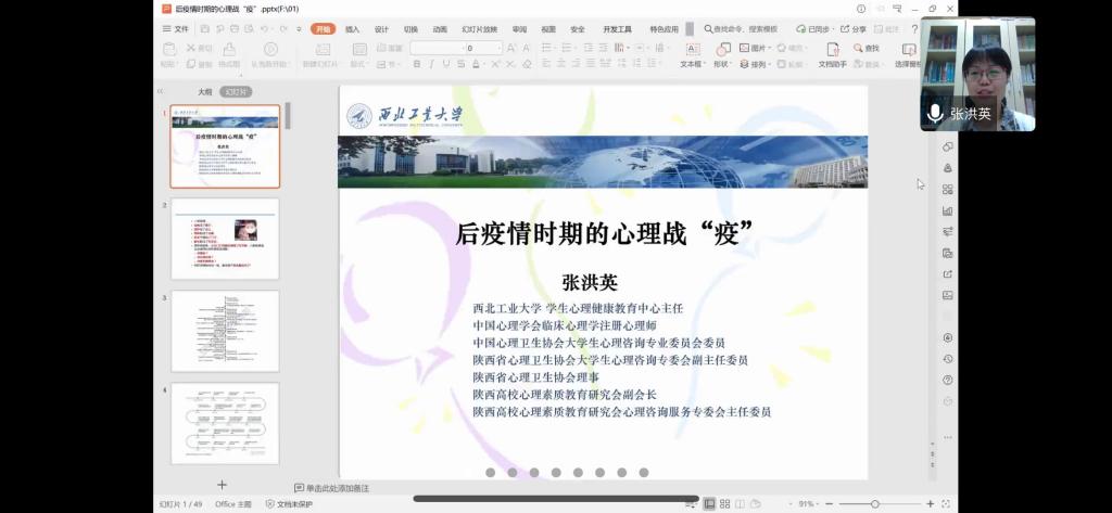 2020年4月24日,Beat365中文官方网站举办2019-2020学年第二学期心理委员培训会,活动邀请西北工业大学学生心理健康教育中心主任张洪英副教授作了题为《后疫情时期的心理战‘疫’》专题报告,机电学院各年级辅导员以及心理委员参加了本次活动,活动由学院心理辅导员秦方刚主持。