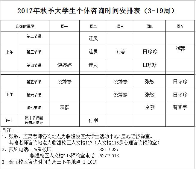根据Beat365官网学生心理咨询工作的需要,现将有关个体咨询时间安排如下,请各学院及时通知学生,在规定时间内预约咨询。