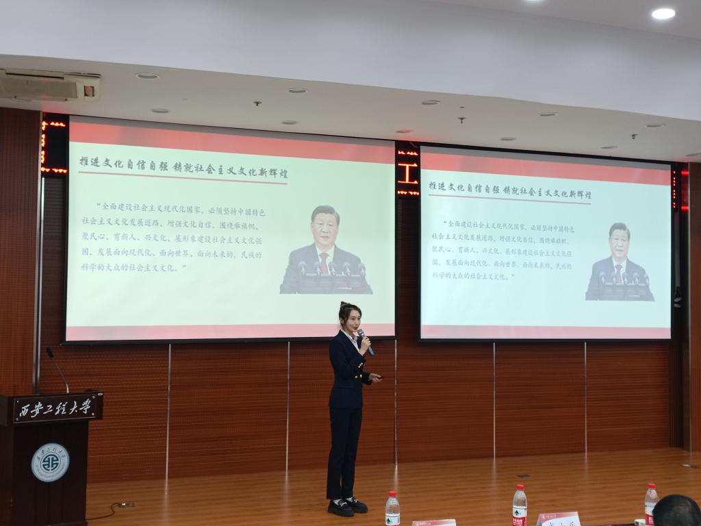 陕西省学习宣传贯彻党的二十大精神宣讲队成员,Beat365官网马克思主义学院研究生张碧容作了题为《坚定文化自信共赴文化强国之约》的主题宣讲。她以党的二十大报告引入,以中华民族五千年文化的历史渊源和中国特色社会主义文化的内涵为核心,以中国共产党的精神谱发展为脉络,回答了“什么是中国特色社会主义文化?”、“为什么要强调文化自信自强?”、“青年如何为建设社会主义文化强国贡献力量?”等三个问题,引导学生深刻领会中华优秀传统文化的独特魅力,增强了学习宣传贯彻党的二十大精神的感染力,动员青年学生要着眼中华民族伟大复兴的历史使命,坚定文化自信自强,为以中国式现代化全面推进中华民族伟大复兴的中国梦凝聚力量。