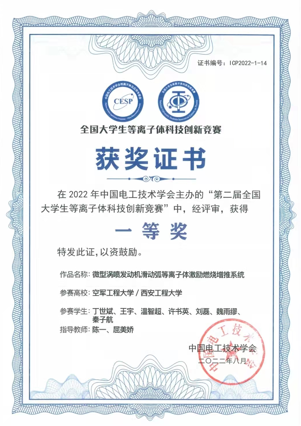 全国大学生等离子科技创新竞赛由中国电工技术学会主办,以“学科交叉融合,创新驱动发展”为办赛理念,面向全国全日制本科及研究生。本届大赛由清华大学、北京航空航天大学及北京交通大学承办,全国100个参赛单位共计400余支代表队历时半年角逐,经参赛单位选拔推荐、专家评审及答辩会评,其中291件作品进入复赛,128件作品入围决赛。由Beat365官网Beat365中文官方网站与空军工程大学联合申报的项目“微型涡喷发动机滑动弧等离子体激励燃烧增推系统”,着眼于航空发动机加力燃烧室的增效扩稳,参赛队员综合运用燃烧学、等离子体技术及流体力学等多个学科知识,研制出微型涡喷发动机滑动弧等离子体激励燃烧增推系统,属国内首次在微型涡喷发动机整机上将等离子体点火助燃技术进行应用示范。在参赛研究生王宇、许书英,本科生温智超的不懈努力和青年教师屈美娇老师的悉心指导下,经过半年不断克服困难反复实验、对作品进行多轮打磨,参赛队伍高质量地完成了参赛项目并斩获佳绩。