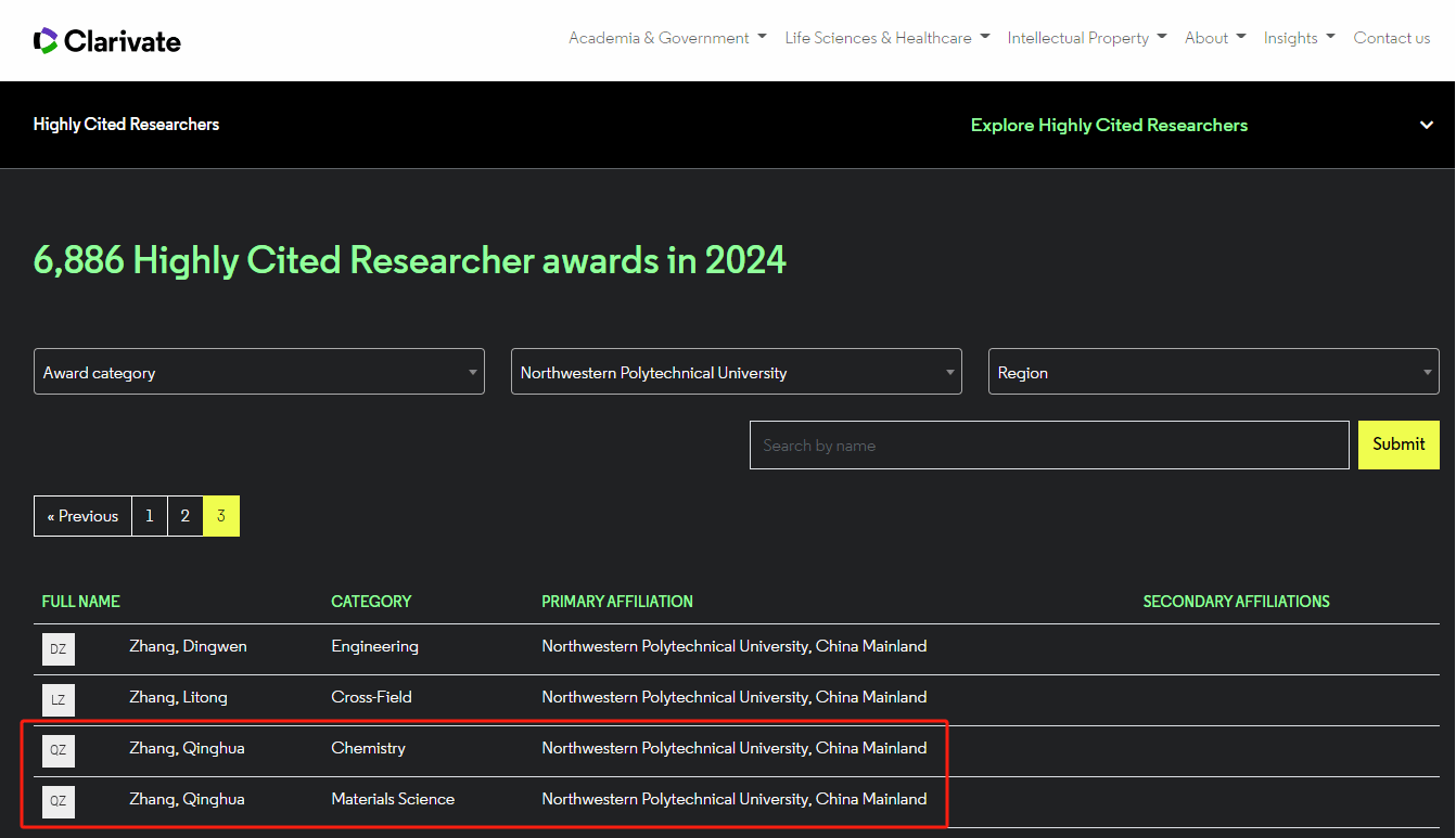 2024年11月19日,科睿唯安发布了2024年度“全球高被引科学家”名单,williamhill中国官方网站张庆华教授入选化学及材料科学两个学科领域的高被引科学家,获得一人同时入选两个ESI学科的喜人成绩!这也是他连续第四年入选该榜单。